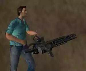 GTAVC:威力最大,至少可以一枪干死一个人。拿着它对黑帮分子狂扫、爆车,橘色的火焰连续地喷出,根本停不下来!机场候机大厅附近草坪上的广告牌(画着一个人冲浪)后面捡取,西岛枪店购买。