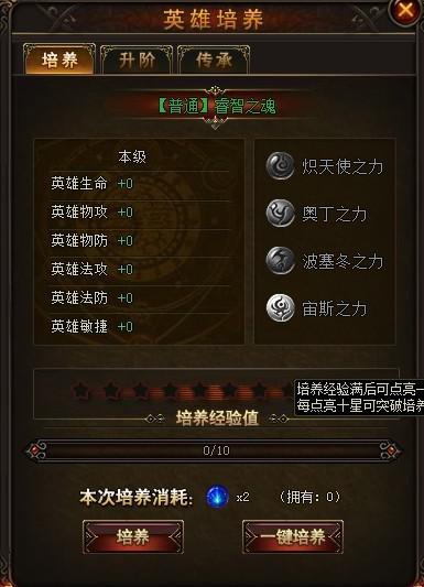 对英雄进行培养的系统可以分成英雄培养、英雄升阶、传承系统三个主要的子系统。这三个系统需要消耗的道具都是灵魂石,所以,对英雄进行培养前,要准备充足的灵魂石。