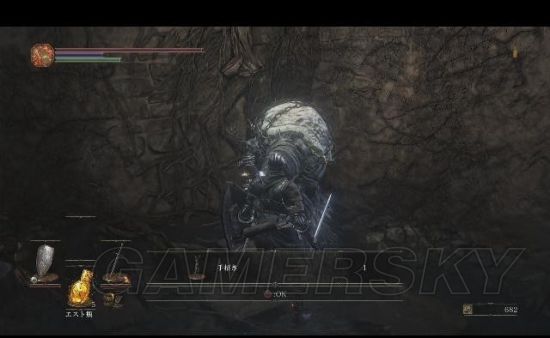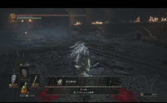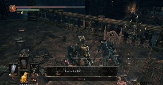 ①:最初见到他和他说完话之后他会给你一个肢体动作,之后在流程进行到击败深渊监视者BOSS之后,他会给你一个法兰戒指之后传送回来会发现他不见了,此时在面对火祭场正门的右手边的一座墓碑前可以捡到他的盾牌(这里我没截图,特征是墓碑周围都是深渊大剑)。PS:在击败之前的几个BOSS后回来和他多说说话他会给你一块贵石。