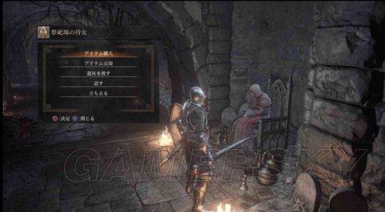 1、不死街で話しかけると火継ぎの祭祀場へ移動2、祭祀場で話しかけるとジェスチャー"手招き"を入手。魔術が購入できるようになる。3、「力を引き出してもらう」とレベルアップが可能だが、貴重品に"暗い穴"があり、徐々に呪いが溜まっていく。?、カーサスの地下墓到達後、祭祀場で死亡する