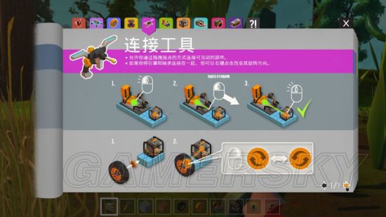 step5.最后是赋予载具生命,就是用连接工具将方向盘与前轮连接,引擎动力与轮子连接。