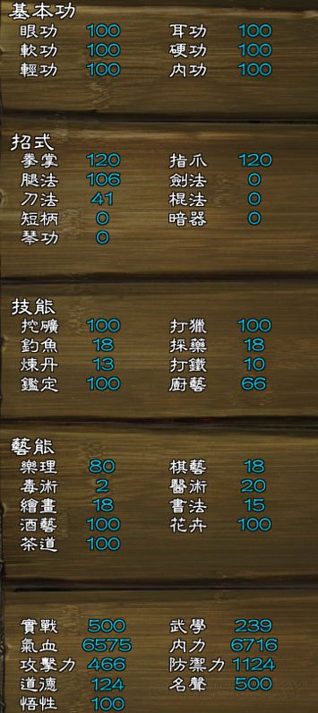 可以达到拳法120 指法120 腿法100以上之谱