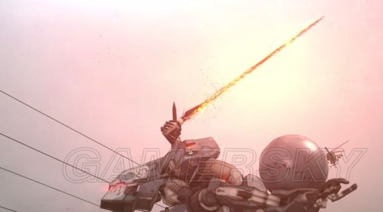 紧接着Sahelanthropus抽出了巨大的长鞭,在挥舞过后又另它固定成了一把剑,劈向了地面,造成了巨大的爆炸与石林的出现。在之前的预告片中Big Boss就遭到过石林的追击,现在可以得知这是新型Metal Gear的攻击方式。