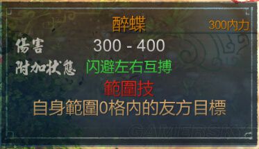 醉棍是生存和输出都很强的招式,第三招醉蝶可以得到提升闪避和双手互搏BUFF,而且还能补血(补血也能出暴击)。双手互搏BUFF就是有几率攻击两次,反击两次,补血两次,不知道物品能不能使用两次,有攻略说双手互搏然后扔霹雳弹能炸两次不知是真是假,反正我醉蝶后扔炸弹没出过炸两次。