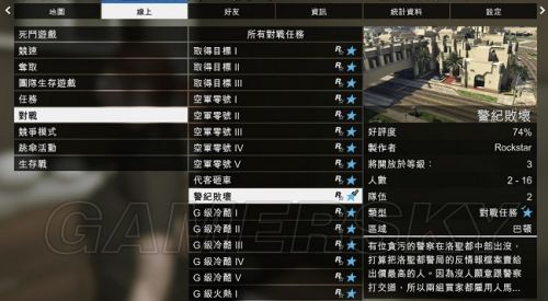 按esc进入暂停选单后 点选在线→R*制作→对战→警纪败坏