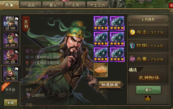 今天刚到118 , 转盘升级了下兵器,从114一直打到117,117整整卡了大半天才过, 实验的很多次,必须太史慈上来抵挡,其他不被当,张飞抵挡关羽,才能过,不然前面3-4档都不一定能过。 过法:太史慈朱雀第一排战法,抵挡部将战法,一直砍最后一排放战法,抵挡了第二部将战法,第二许褚独龙 一直砍最后放战法,低兵器真悲剧,这样都只能剩下一排吃战法。 第三 黄忠 白虎(典韦 基本太史慈抵挡了,他就被挡,完全无语,只能放下)一直砍,最后满血一排对第三个部将最后一排,直接战法,拼死了,真霸下张飞上场,最关键的抵挡了,呵 呵,碾压过去了!。