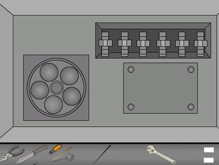 10、检查桌子上放着的奇怪仪器,点到仪器内部把5个铁球放入那个仪器里面的转盘,螺母放在第五个螺柱上,用扳手拧紧。仪器外面按左边圆圈有X的按钮,拿到黄色钥匙。