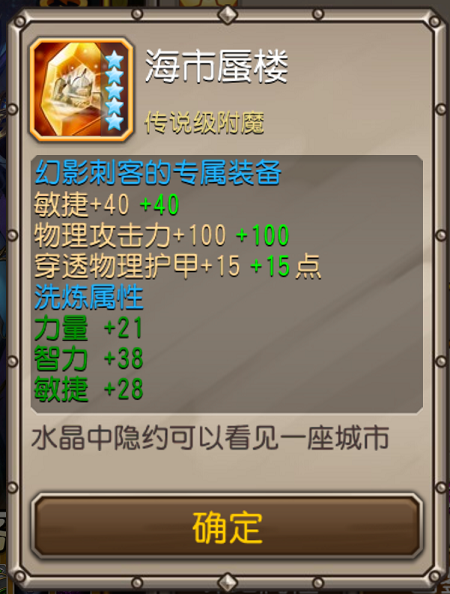 影刺客觉醒装备海市蜃楼,可以增加PA的敏捷40点、物理攻击力100点、物理穿透15点,附魔之后可以翻倍,加上满犀利可以增加21点力量、38点智力
