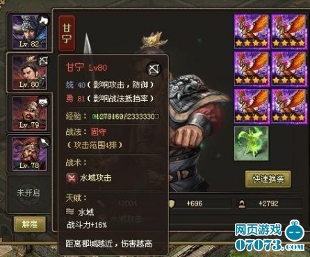 第二个红将甘宁。属于统低勇高的人物。我的搭配很简单完全是朱雀套装的样式。2攻击+4强壮。秒杀流最佳代表就是甘宁。虽然夏侯惇和许褚战法也是打四排但是他们2人勇还是较低比较容易被抵挡。甘宁只要带个杯子基本没被抵挡过(除了碰见甘宁)。