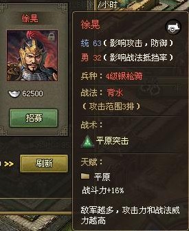 第五个红将徐晃。属于统高勇低的人物。在没有马超之前我最喜欢用他了。他的战法打三排在前期可以适当穿1个战法,到了后期对甘宁和马超就容易被 抵挡了。所以还是以强防和强攻为主。注意徐晃的特点敌人越多攻击力和战法就越强。所以用他在平原堵远征军效果不错。当然你装备要过硬了否则就是送菜了。哈 哈。