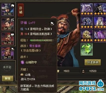 第四个紫将许褚。属于统高勇低的人物(我现有的将中他的统最高)。我的搭配前期为了升级快给他穿过血量装。等75级以后换的装备跟吕蒙类似3强攻2强防1掌控。曾经试过穿4强攻+2强防打架砍人时候很爽但是一个将无法刷城,被守卫战法打的太痛。