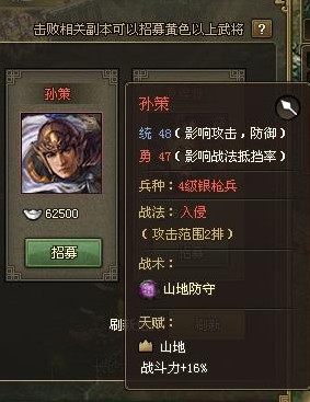 第六个红将孙策。典型的统勇均衡人物。前期红将中大家应该都很喜欢使用他吧。他的战法虽然只打2排但因为勇在红将里还算高的所以前期可以穿 1-2个强壮。到后期还是穿2-3强防为好搭配2强攻1掌控。尤其70级的荒蛮副本多为山地地形,所以孙策的出场率还是很高的建议给他弄一套好装备过副本 会容易很多。