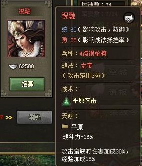 第九个红将祝融。属于统高勇低的人物。作为目前能招募的唯一女将,她的出场时间实在有点尴尬。后面紧跟着就可以招募到第一个紫将马超而且2人都 是平原将。唉。。。为我们女同胞的出场不利叹口气。她的战法打三排而且在红将里勇不算太低可以考虑穿1-2件战法装备。她的特点是打蛮族有伤害和经验加 成,在国战打蛮族任务中还是可以出场溜溜的。如果是守城建议穿强防、掌控和血量,攻城建议穿强攻或攻击、强防和掌控。具体要看你们国家蛮族是多少级的根据 自己的装备水平适当搭配为佳。