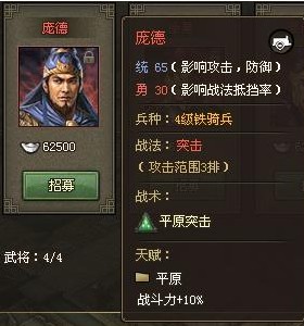 第十个红将庞德。属于统高勇低的人物。作为第一个可以招募的红将他还是很给力的。我现在还记得当初招他的时候挺激动的觉得他比黄将厉害好多。哈 哈。等招第一个紫将时候完全不激动了就觉得任务很麻烦而已,汗。。。他的战法打三排前期可以穿战法装等后期还是推荐以强防、强攻、掌控和血量为主。作为前 期的红将他的寿命毕竟不会太长基本上等徐晃出场他也就可以休息去了。