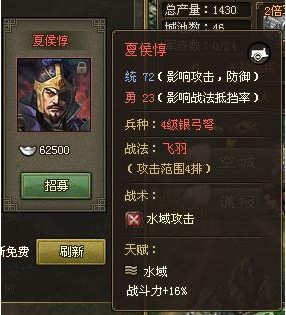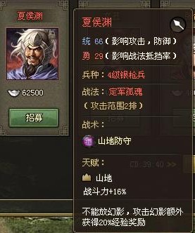 第八个红将夏侯渊。属于统高勇低的人物。他的战法只能打2排而且勇低所以完全不用考虑穿战法装备了。他的特点也有点鸡肋不能放影子但打影子有经 验加成。我真心想说一般影帝放的影子用渊子估计打不动尤其对0元党来说。汗一个先。但是0元党要想简单点过70荒蛮副本还是建议练一下他的。毕竟他是山地 将有额外加成。装备搭配可以考虑加强防、掌控和血量当肉盾用。