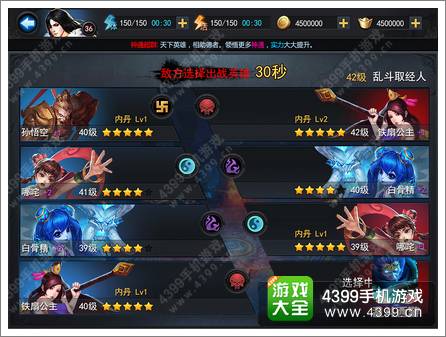 每个选择回合有30秒限制,如果限定时间内没有做出选择,则系统默认选择其当前实力最强的英雄,并进入到下一个选择回合。选择阶段结束后会进入5秒倒计时,倒计时结束进入开战状态。
