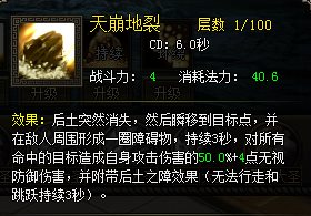 后土的第一个技能就是冷却时间,为1秒,该项技能属于群攻技能,该项技能也为玩家们提供一个主动优势的机会。第二个技能围困技能,属于控制技能。对手被中招以后会被困住3秒时间,这绝对是绝地反击的大好时机。第三个技能是减速技能,如果玩家们配合围困技能同时使用,游戏效果则为更佳。第四个技能则为高攻击技能,攻击爆率的几率大增。于此同时很多玩家们提出疑问,那怎么才能攻克后土完成通关呢?其实只要将后土死卡在一个位置以后,然后转换卷帘攻打,接着在后土前后进行攻打跳跃,躲过图强之后,你便会成功了。那么我将要为各位玩家做一个小提醒,在BOSS前后跳跃的时候一定要有节奏,而且事先的准备工作一定要做好,打后土很消耗蓝,所以在攻克之中玩家们一定要吃个大蓝来增强属性。