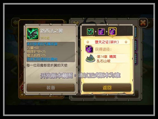 为末日使者佩戴觉醒装备路西法之翼,路西法之翼需要用堕天之证、泰坦战斧、禁卫军胸甲、永恒冰柱来合成,看到这些装备就知道合成品是个半肉半输出的装备了,至于堕天之证的碎片需要在第14章的精英副本乱石山坡获得。