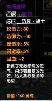 攻击力80、防御力-10、暴击率5%、闪避率5%、回血-2