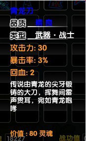 孙悟空的两把精良蓝装武器之一,属性方面与天煞月戟各有长处,谁高谁低的争论也一直没有停止过,个人感觉在20级以前还是青龙刀比较好,去刷低级龙王的时候有可能很容易就获得青龙刀。