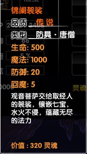 锦阑袈裟是刑天掉落的终极防具,虽然只有属性的支持但是唐僧在能搞定刑天后需要拿到的防具,刑天一共掉落六件传说装备,分别是孙悟空、猪八戒和唐僧的终极武器和防具,锦斓袈裟的掉落几率在6-8%左右,不少朋友都因为刑天不掉自己职业的终极武器而崩溃,耐心一点总会打到的。