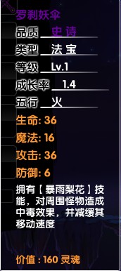 从一级的属性来看罗刹妖伞具有更好的攻击和防御加成,并且附带技能暴雨梨花,算是怪物的减速技能,法宝之中比较不错的一件史诗级装备,如果能获得一个高成长率的罗刹妖伞是相当不错的,罗刹鬼衣在第三关的秦广王傀儡掉落,罗刹镰刀是第五关判官殿的判官掉落,罗刹指环在第八关的孟婆掉落。就是说只有能打过第八关才有可能收集器合成罗刹妖伞的三件物品,掉落方面普遍反应罗刹鬼衣和罗刹指环不好掉,其实爆率基本是固定的,两件物品的掉落几率都在15-20%之间。推荐能通过孟婆的朋友一定反复刷到三件装备合成法宝罗刹妖伞。