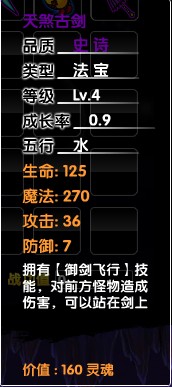 拥有【御剑飞行】技能,对前方怪物造成伤害,可以站在剑上。