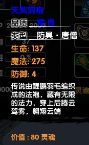 天煞羽袍是唐僧的典型防具,提供生命和魔法的属性,防御对于唐僧而言并不是最为重要的,因为无论唐僧防御多少要做到的仍然是在怪碰到唐僧前消灭掉怪,天煞羽袍获取相对容易,秦广王比较好打,可以反复刷直到爆出天煞羽袍,天煞羽袍的掉落几率大概在12-25%之间。