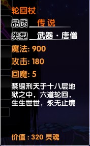 唐僧的终极武器,也是出产与超级BOSS刑天,刑天的通关难度要难于造梦西游1中的高级龙王,但是掉落的装备也远远好于龙王,6件三种职业的传说级武器装备足够玩家口水很久的,只有获得轮回杖的唐僧才能应对最终的挑战,掉落几率方面轮回杖的掉落几率在5-10%之间,虽然爆率不高,但是绝对值得我们反复刷刑天来获取这些绝世装备。