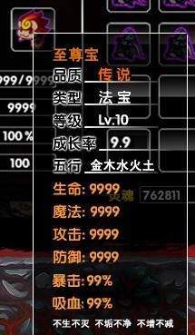 所有属性都为9999或者是99%,最后标注是不生不灭 不垢不净 不增不减。拥有强大属性的传说法宝经过Orz小游戏的鉴定应该是传言而已,在最新的造梦西游3试玩版中也没有这件物品,所以很可能是玩友杜撰然后通过PS合成出来的照片。