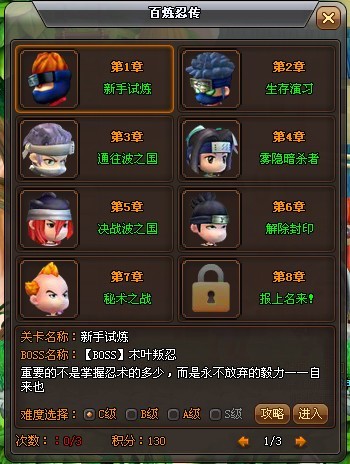 百炼忍传还有一个特殊性,因为是自来也的修炼之路,副本要求只能单人进行挑战,并且不能死亡,这非常考验玩家角色的能力。