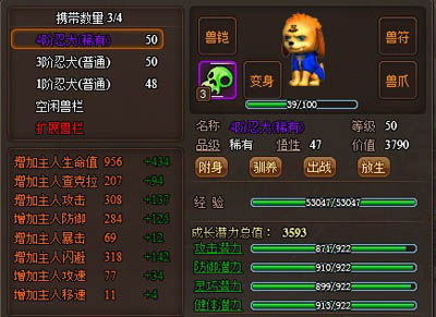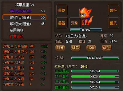 可以对比一下两只同样为50级的忍犬不同品级的差别,从属性到悟性再到成长潜能,可以看到差距相当之大。