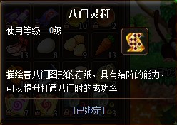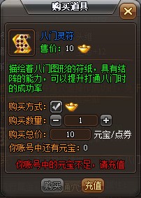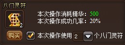 开通穴道时可以选择使用的八门灵符,每张八门灵符可以增加成功率5%,在游戏后期打通八门时需要相当多的八门灵符,所以想完全使用灵符打通穴道需要RMB支持。