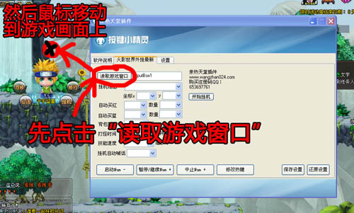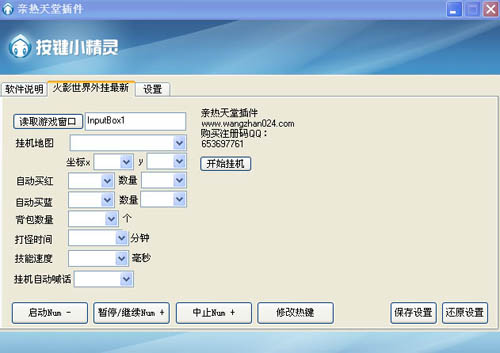 第二步:启动插件,点击火影世界外挂最新按钮,这时你会看到插件设置界面,上面有注册码购买QQ和官网地址。
