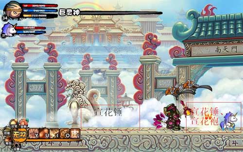 南天门的巨灵神爆点一个是在画面中石狮子右边一点,多数会爆宣花锤,另一个是在南天门下,爆宣花锤和宣花袍都有一定的可能。