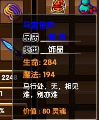 马官指环是中期的一件蓝色精良品质的饰品,但是orz小游戏认为这个饰品的价值并不高,因为马官指环算是通风灵戒的升级版本,只是多加了生命和魔法,并没有在攻击或者防御方面得到比较好的支持,所以如果玩家可以入手别的饰品会比马官指环具有更高的性价比,如果你是一个收藏装备的爱好者,那么可以在抓宠物的过程中去碰碰运气,毕竟官方团队修改游戏后马官指环制作书的爆率相当不错。