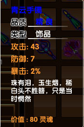青云手镯是游戏前期一个非常不错的蓝色品质饰品,由西天王殿的广目天王掉落,广目天王共掉落两种装备,一个是青云手镯另一个是混元龙铠,作为前期加攻击、暴击和防御的饰品,青云手镯是相当不错的,所以推荐玩家一定刷到这个极品蓝色饰品。