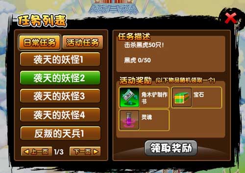 造梦西游角木铲如何合成,首先要拥有角木铲制作书才能合成这件武器,制作书需要做任务获得,在造梦西游3的系统中新增了任务系统,每次完成任务会给一定的奖励,前期的任务都是打一些关卡中的小怪,比如角木铲制作书的任务要击杀黑虎50只,完成任务后就可以领取奖励,奖励中包括角木铲制作书、宝石和灵魂,完成后随机获取三种奖励中的一种。