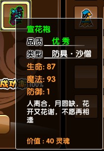 宣花袍是沙僧的绿色优秀品质防具,沙僧的装备都存在属性过于分散的弱点,生命、魔法和防御各自职能增加一小部分,使得装备的优势甚至不过一个宝石。