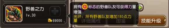 觉醒技能:野兽之力,给“野兽”队友增加180点力量,该技能不计入面板属性。