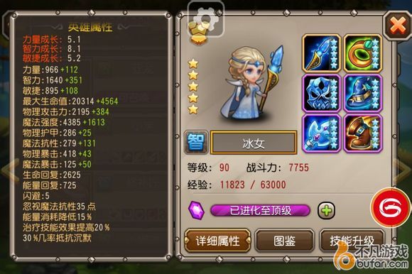 第二批觉醒中排,法系里面人气颇高,远征和竞技场都是好手。可以搭配很多法师组成坑敌法的队伍,在巅峰竞技场里面有不错的表现,让我们来看看冰女觉醒之前的属性