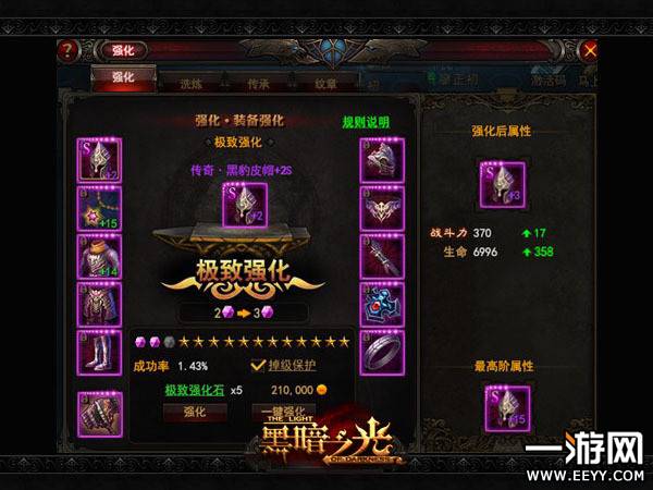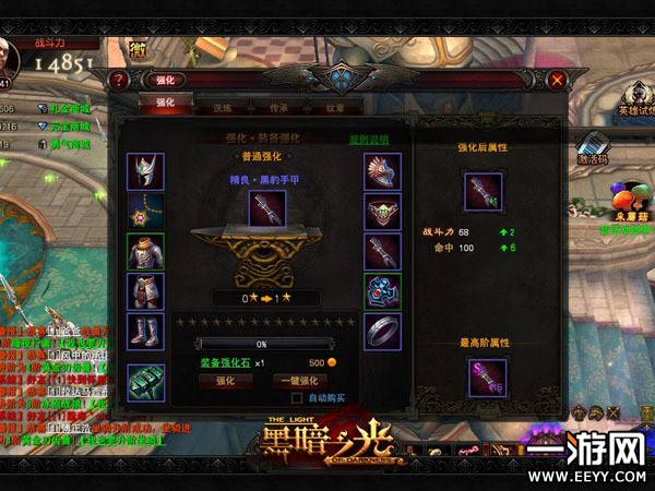 黑暗之光的装备强化功能分为普通强化和极致强化。普通强化,消耗装备强化石和金币,提升装备的属性。在玩家的记录中,以裤子为例,一件20级蓝色精良品质 的牦牛护腿战斗力为50,基础属性为防御+30,附加属性为魔法+5、闪避+6。再点击强化按钮消耗两颗装备强化石和1000金币后,会给予护腿战斗 力+3、防御+2的属性加成,星级会提升到1星。