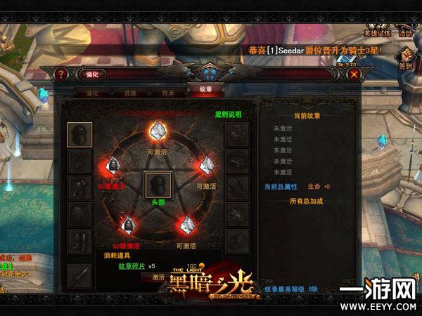 纹章功能,要先激活相应的装备纹章并升级,纹章等级最高,装备属性加成也就越高。以头部纹章为例,激活要该部位第一个纹章需纹章碎片5个,激活后属性加成 生命500,战斗力+5。随着纹章等级的提高,升级消耗的纹章碎片越多,属性加成亦呈倍增长趋势,比起积攒能量槽的玩法,升级纹章可是一次就可以成功的, 五个纹章孔位随着角色的等级逐一开启。