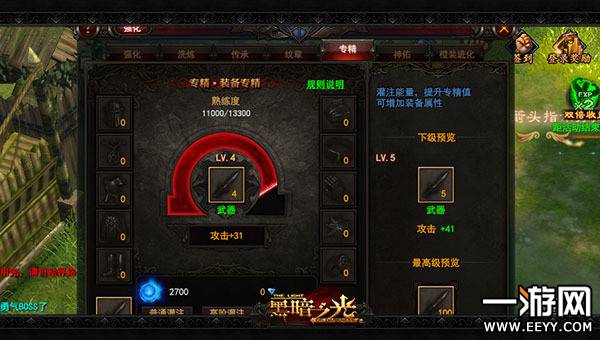每件装备都可以专精获得属性,不同装备部位获得的属性是不同的,比如:专精武器可以增加攻击力、专精头部可以增加生命值、专精鞋子可以增加闪避。如果你需 要把你的角色培养成一个强有力的输出的话,尽全力的专辑项链、武器、鞋、戒指吧。如果全部升满后会为你提供一个非常恐怖的攻击力。
