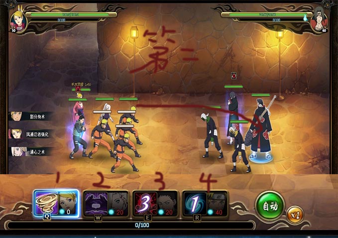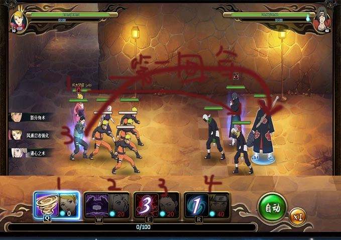 下面讲攻略,第一回合,鹿丸定身(4)鬼鲛,井野接上混乱鬼鲛。同时风主技能(1)打鼬.第一回合要保证的是尽量让鬼鲛砍一下鼬,两下最好,一下都没就退吧,浪费时间。