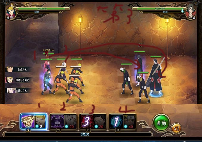 本攻略的核心就是,由于第一回合鼬的月度使第二回合对面技能全能放,对面的体能控,只有鸣人站的1号位放的螺旋丸控不住,小浮空,追打,倒地,定身, 混乱。注意的是鹿丸的定身和井野的混乱在打鬼鲛的时候必须让鬼鲛吃到,还有就是每回合鬼鲛砍鼬的次数,一回都砍不中就退。后面几个回合就简单了,主要就是前三回合。