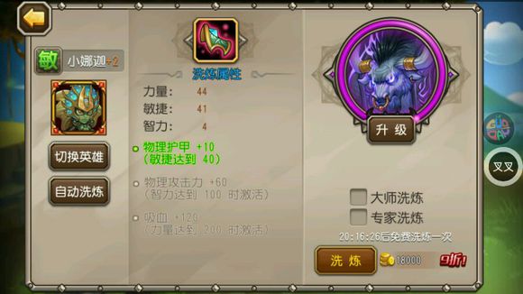 小娜迦洗练的第一种就是单洗敏捷,敏捷可以提升小娜迦的攻击以及护甲,还能激活属性再次增加护甲,属于比较肉的洗练。