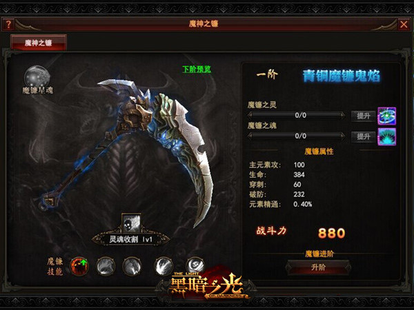进入二转1级后,可激活“魔神之镰”功能,升阶魔神之镰可增强主元素攻击、生命、穿刺、破防、元素精通属性。进入“魔神降临”状态后,角色将手握魔镰。
