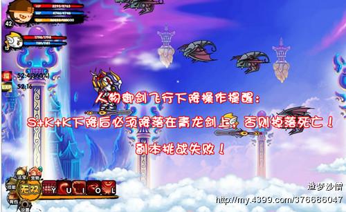 副本是在天空中飞行的,所以御剑飞行的使用方法大家一定要熟悉,S+K+K下降后一定要保证落在青龙剑上,否则就会副本挑战失败。