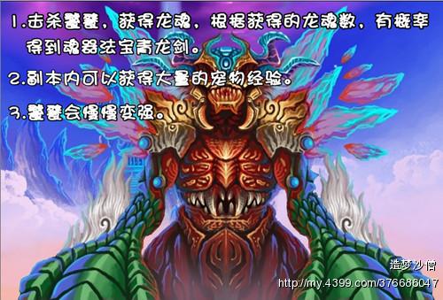 说明中1.击杀饕餮可以获得龙魂,根据获得的龙魂数量,有几率获得魂器法宝青龙剑。2.副本内可以获得大量的宠物经验。3.饕餮会慢慢变强。4.该副本活动期间每天只能进入三次。